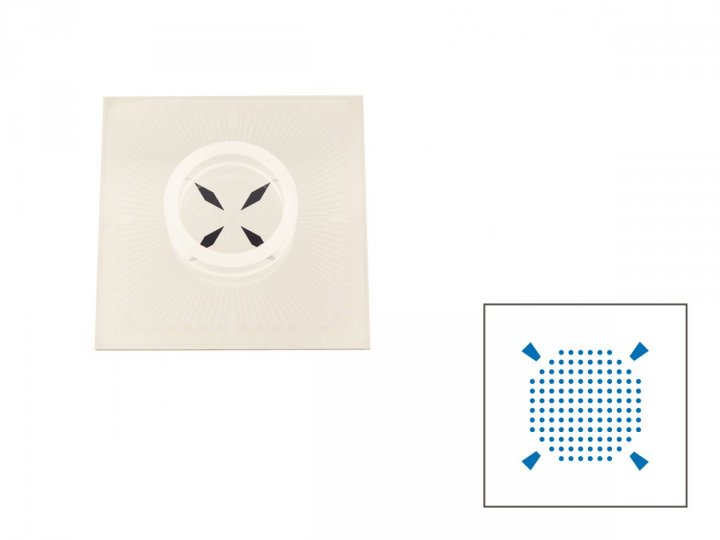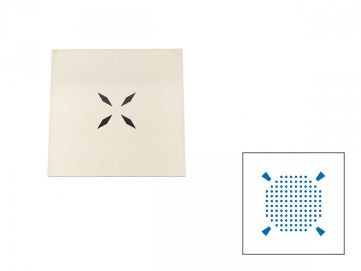 Transparent TiN electrodes, SiN isolator, contact pads and tracks transparent (ITO), with 4 internal reference electrodes, electrode grid 12x12, 120 electrodes, electrode spacing 100µm, electrode diameter 30µm, without ring, warranty: 6 months.